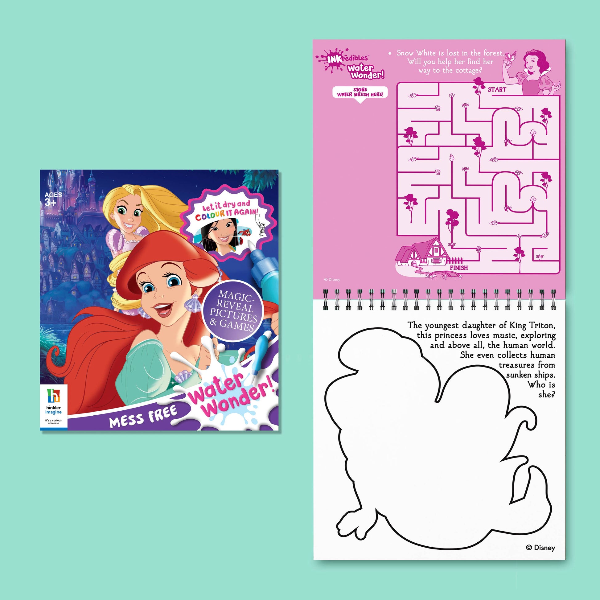 Watch your favourite Disney princesses appear right before your eyes using nothing but water! Use the refillable Water Wonder brush on the blank pages to see Ariel, Jasmine, Rapunzel and Mulan appear like magic. Bring the colourful scenes and fun activities to life, then let them dry and enjoy the mess-free magic again and again! • 1 Refillable Water Wonder brush • 6 pages of colouring and activities including 3 reveal pages.